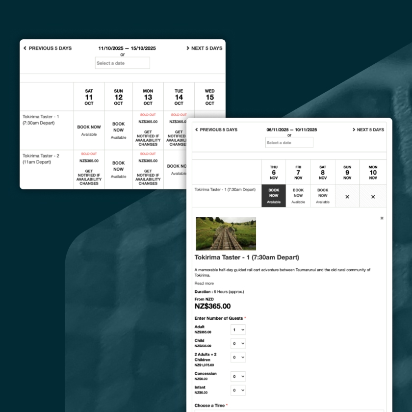 Sturdy footwear (no jandals), sunglasses, sunblock, sun hat, camera, water bottle, snacks, layers/warm clothing (gloves, beanie hat, scarf – we often experience four seasons in one day), waterproof jacket, warm jacket, insect repellent and allergy medications. A waterproof storage container for bags/belongings is available on the rail carts.